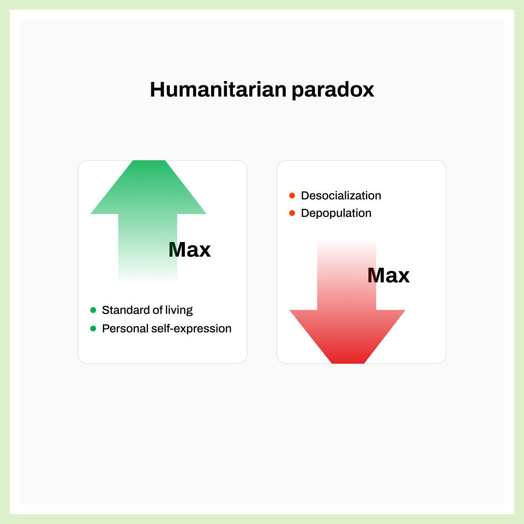 In turn, the Oxford concept interpreted human development as individual well-being and freedom of self-expression. Grounded in this concept, the UN’s Human Development Index (HDI) which measures income, life expectancy, and education levels, highlights the inverse correlation between these “human development” indicators and birth rates in different countries. This reinforced the perception that large populations are underdeveloped and hinder both the sustainable progress of humanity and the “human development” of individuals in each country. There was only one notable exception, which we will discuss later.