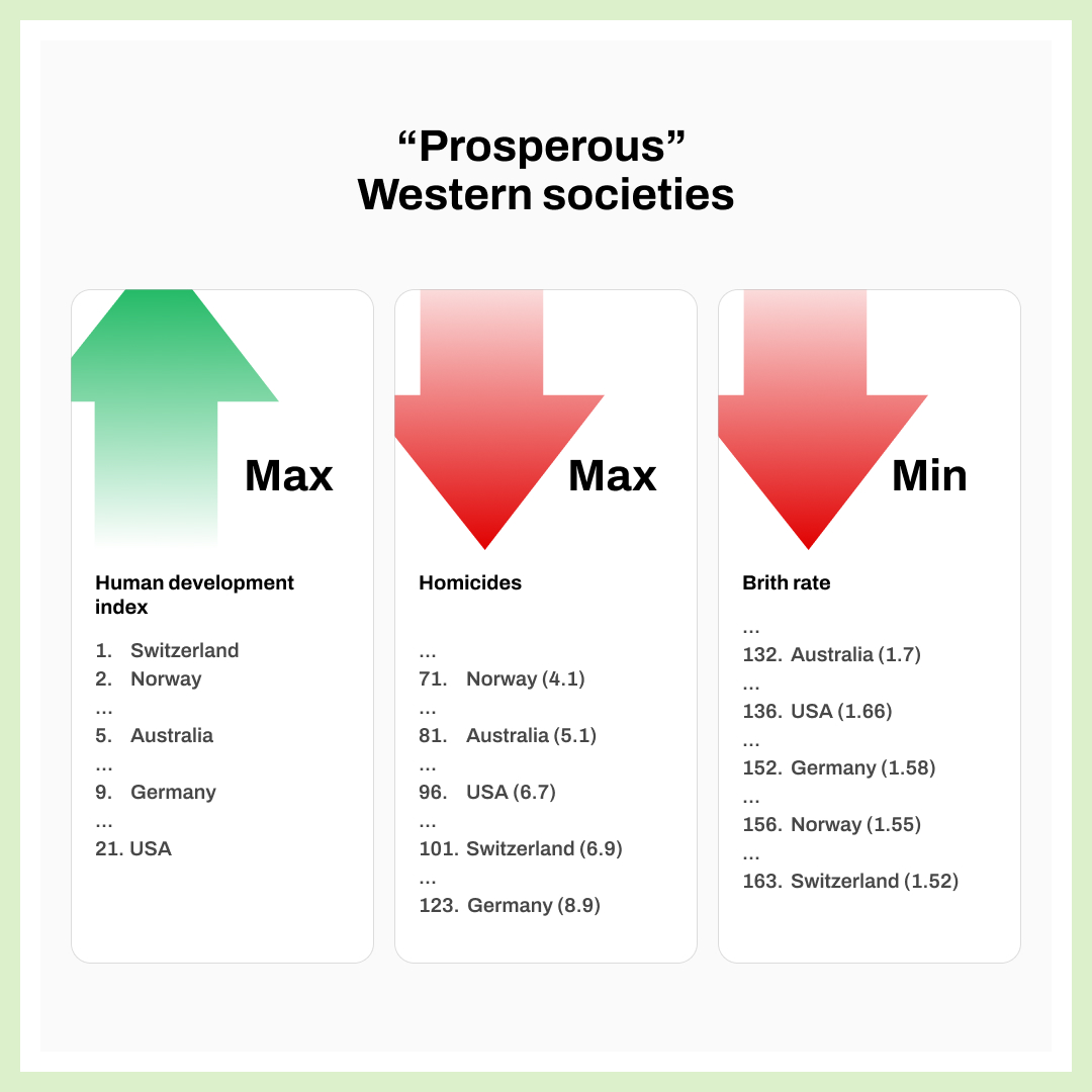 The humanitarian paradox seen above appears to be universal, affecting nearly all countries in today’s globalized world, and particularly the most “advanced” nations, which form the “core” of the modern world system. To illustrate this point, let’s consider some of the wealthiest and most developed Western countries—specifically the United States, Germany, Switzerland, Norway, and Australia—which top the UN Human Development Index. Now, let’s take a closer look at the statistics on murder rates (number of homicides per 100,000 people) and birth rates (total fertility rate) in these supposedly prosperous societies.