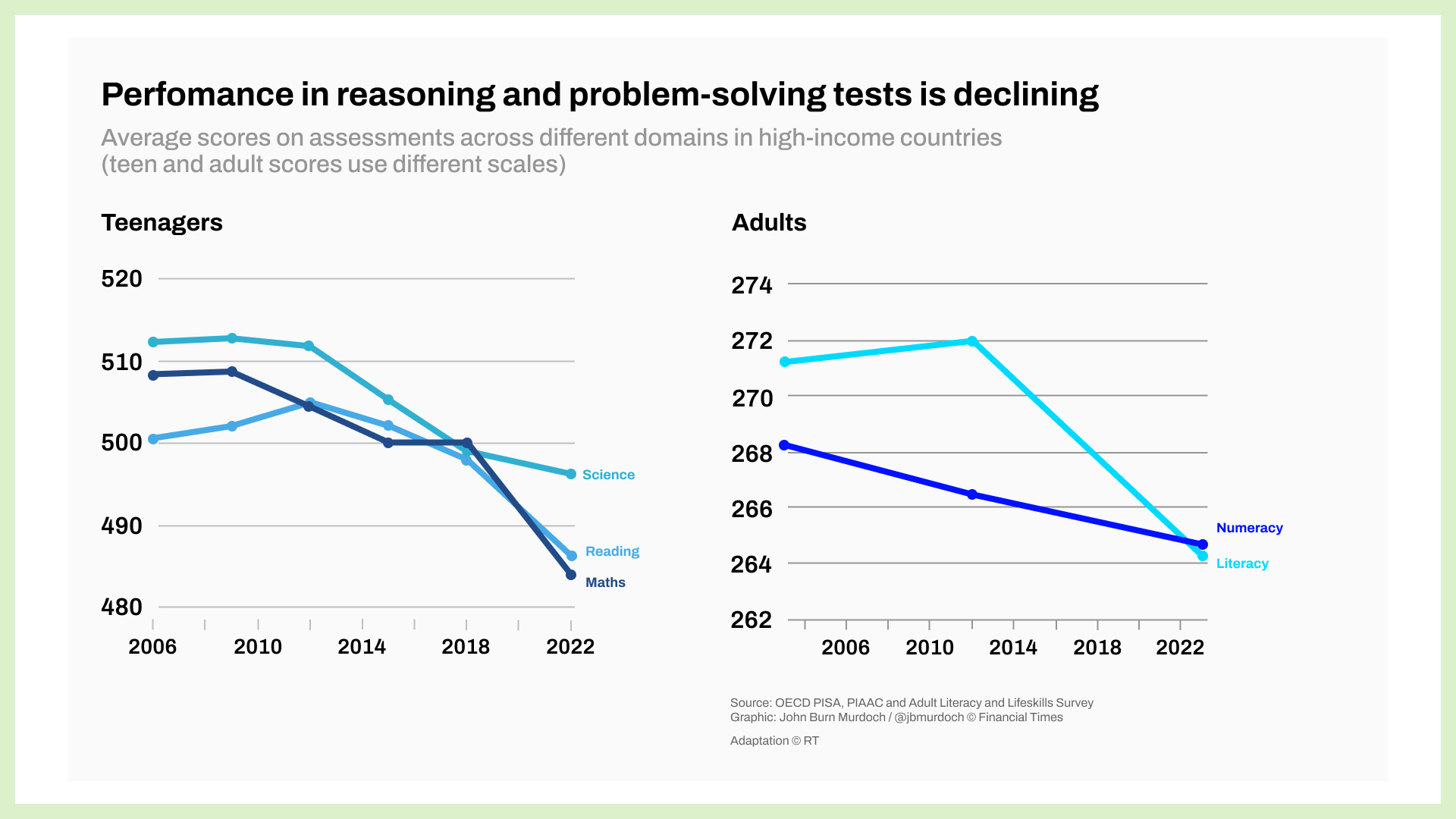 Russian psychologists found that in the “information society” the pathomorphosis (the clinical picture of illness) in patients suffering from schizophrenia has changed radically: their delusions became structureless, ragged, unsystematic – despite the fact that the very essence of paranoia consists in its astonishing . The change in pathomorphosis in clinical form reflects the universal effect of destructuring human thinking under conditions of a hyper-informational environment. This is an existential challenge for Homo sapiens. This is precisely where one should look for the reasons behind the decline in the average intelligence indicator after 2010: as John Burn-Murdoch writes in the Financial Times, fewer and fewer people can concentrate on one task, solve basic puzzles, and think logically (see charts).