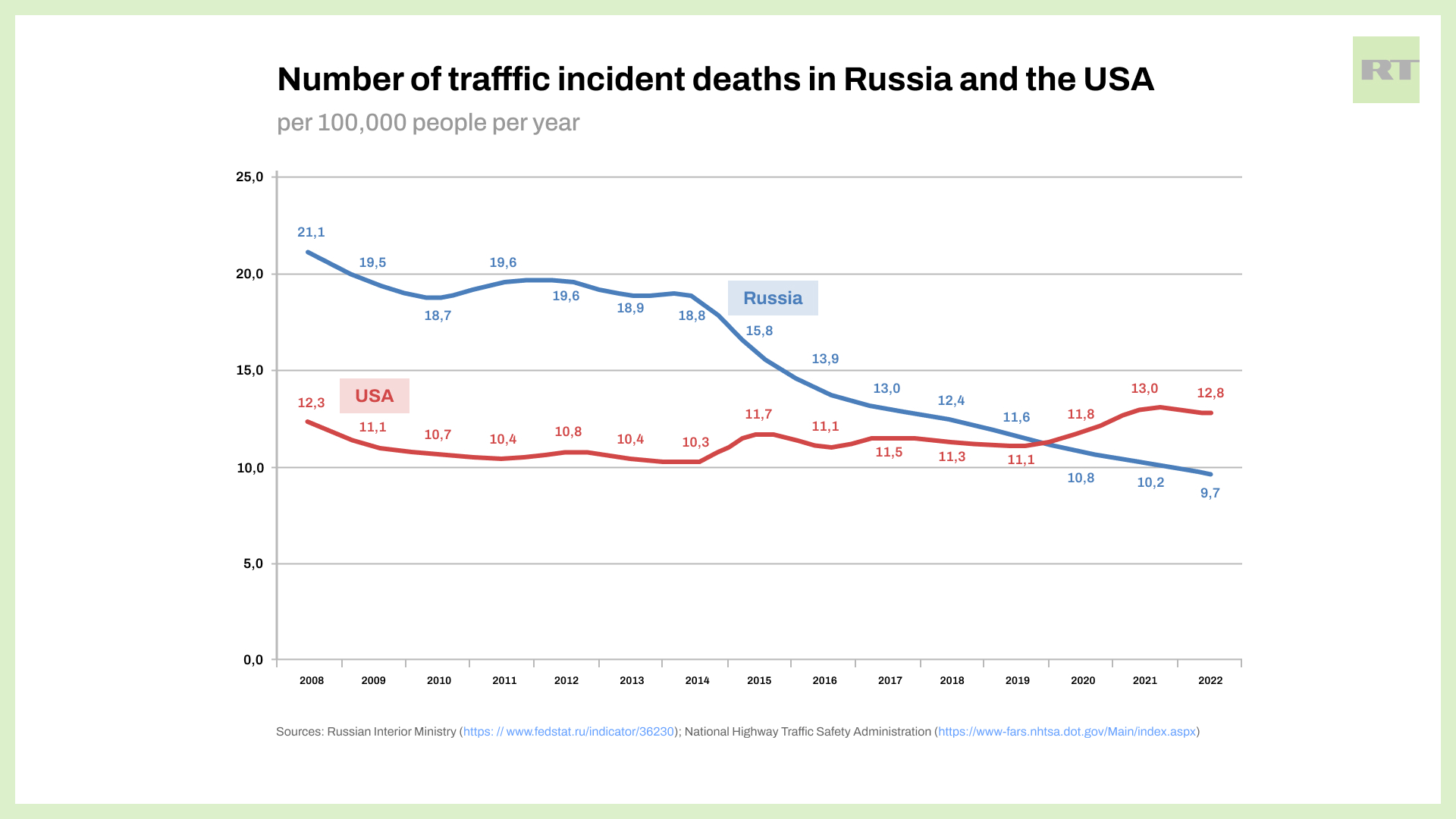 Road-traffic mortality accounts for the largest share of external-cause deaths. This long-standing, painful problem has also seen noteworthy improvements. (The original document compares Russia and the U.S. graphically.)