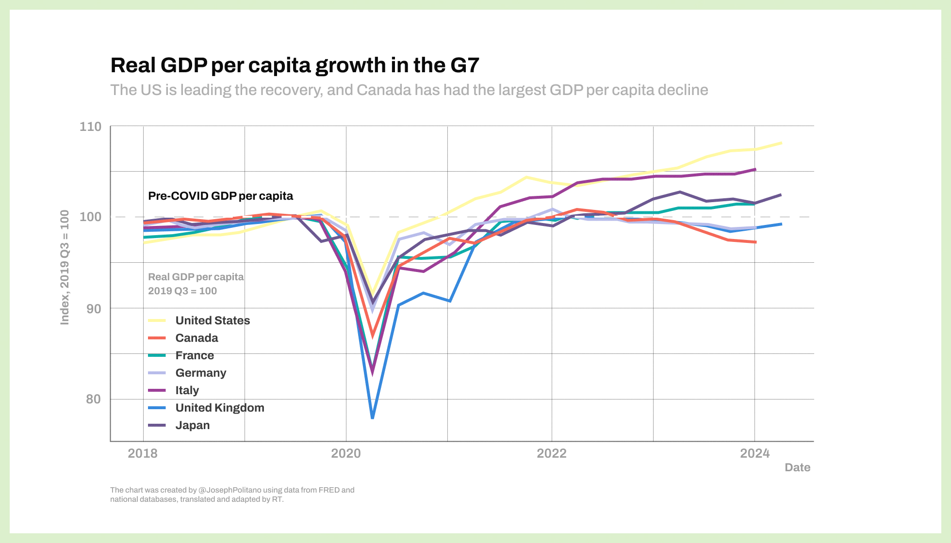 Alas, prosperity has ended. Domestic and international observers note an almost decade-long depression in the Canadian economy and attempt to identify its causes while avoiding strategic generalizations. Meanwhile, the Canadian crisis is merely a reflection of the structural crisis of globalized financial capitalism. Moreover, the main factors behind Canada’s past success – proximity to the United States and large-scale immigration – have now turned into risk factors. The scale of the problem is evident in the chart showing current dynamics of real GDP per capita in the G7 countries.