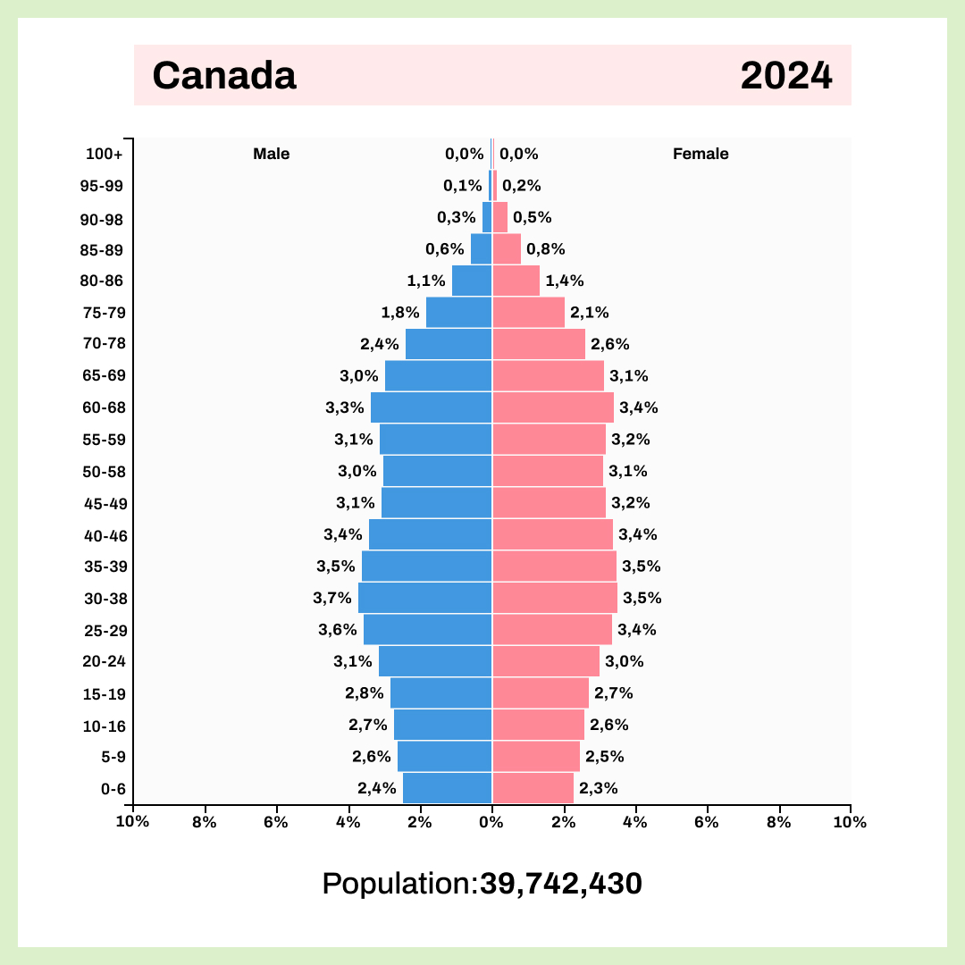 A glance at Canada’s 2023 demographic pyramid shows how little it resembles a proper pyramid. One also notices the pronounced baby-boomer generation aged 60–65. This means Canada stands on the threshold of a sharp increase in the share of retirees and equally sharp growth in social and healthcare expenditures. Pension fund obligations and federal and provincial budgets will expand dramatically – while Canada’s public debt already exceeds GDP.